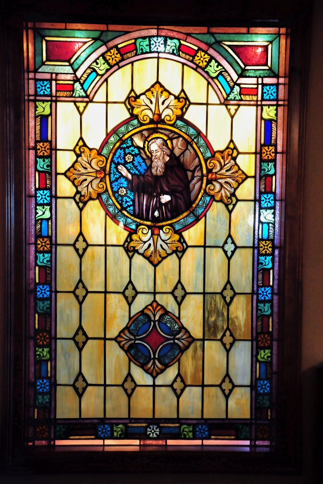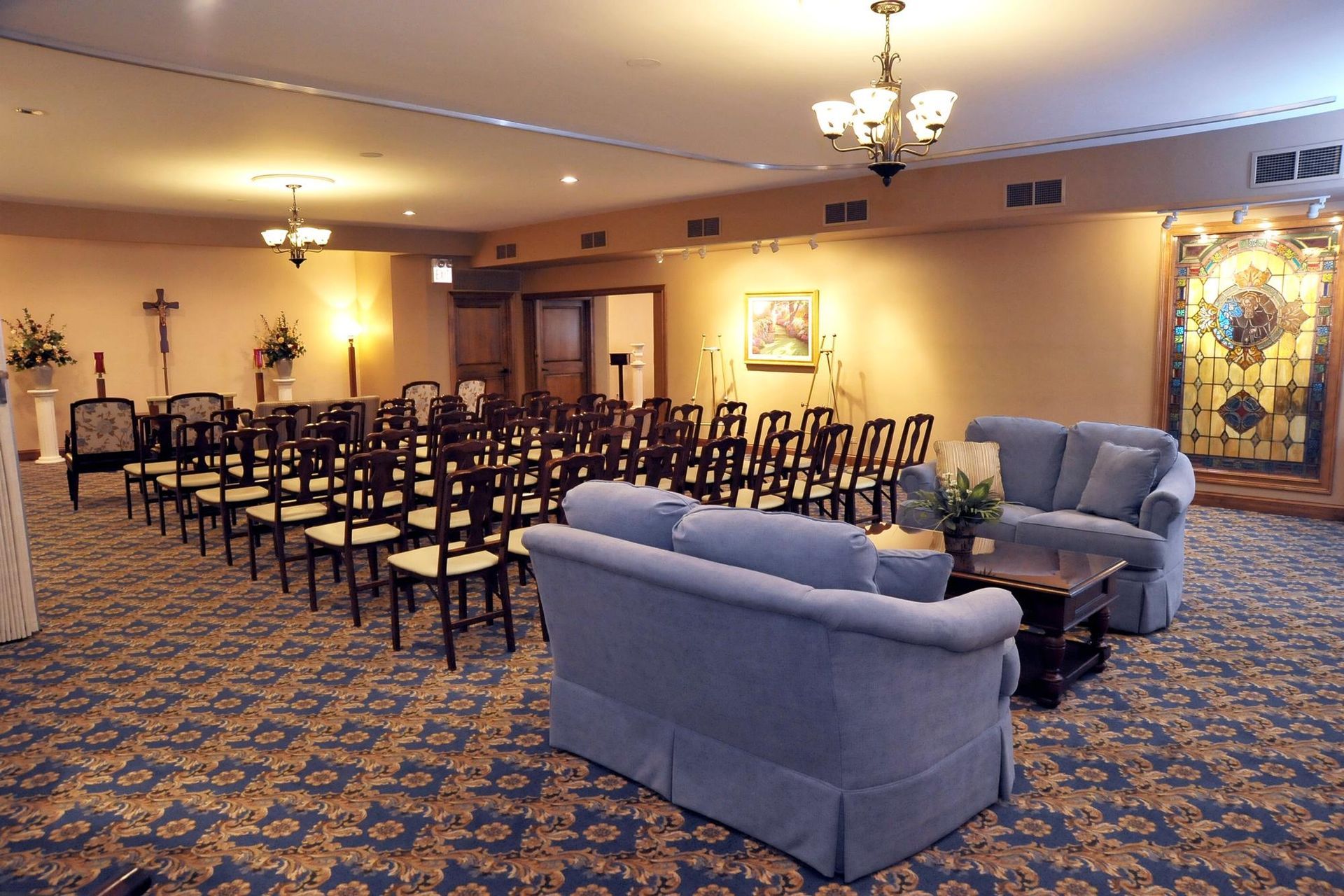 This beautiful stained glass window comes from the former Sacred Heart of Jesus Catholic Church in the Back of the Yard's neighborhood of Chicago. It was originally two windows donated to the church by our founders Leonard and Anna Wolniak. With a bit of creativity and restoration, the two windows were combined into this beautiful image that is prominently displayed at the funeral home between both chapel's making it visible from both sides.